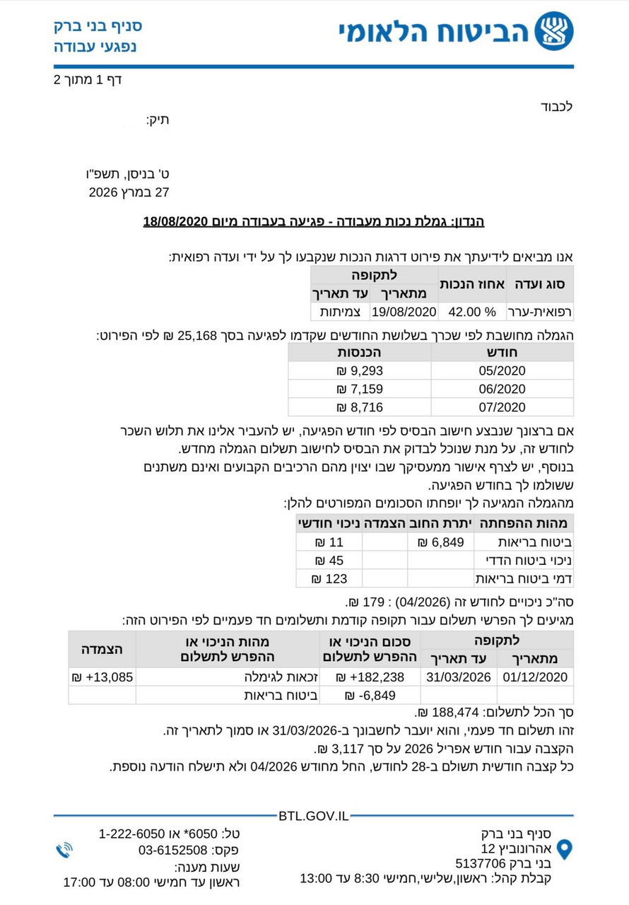 לקוח אשר עבודתו כללה תנועות חוזרות ונשנות עם הכתפיים, הוכר על ידי המוסד לביטוח לאומי כנפגע מחלת מקצוע, ואושרה לו קצבה חודשית לכל החיים בסך 3,117 ש״ח. בנוסף, אושר לו תשלום רטרואקטיבי בסך 118,474 ש״ח. הטיפול בתיק בוצע על ידי משרד עורכי הדין אימבר גולן פרטוש, אשר ליווה את הלקוח לאורך כל ההליך, לרבות בוועדות הרפואיות, עד למיצוי מלא של זכויותיו.